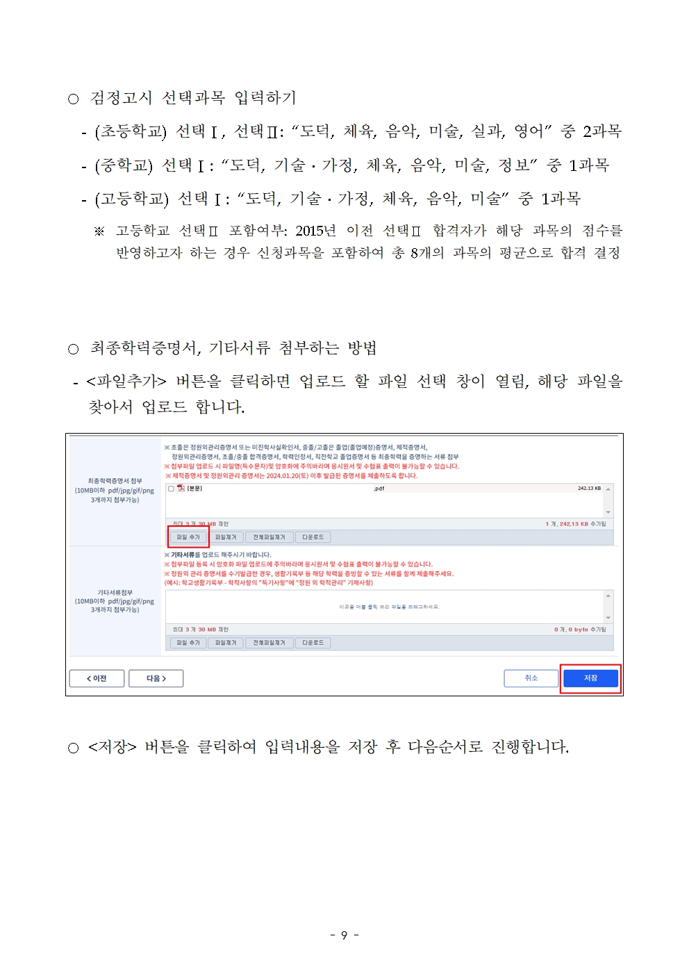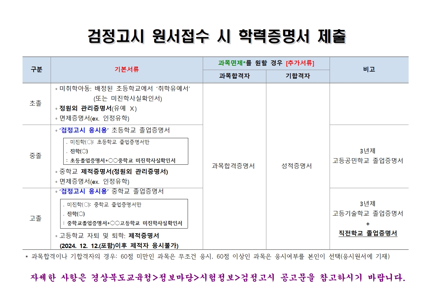 (단, 졸업증명서의 경우 반드시 진학사항이 기재된 검정고시용 졸업증명서에 한함)