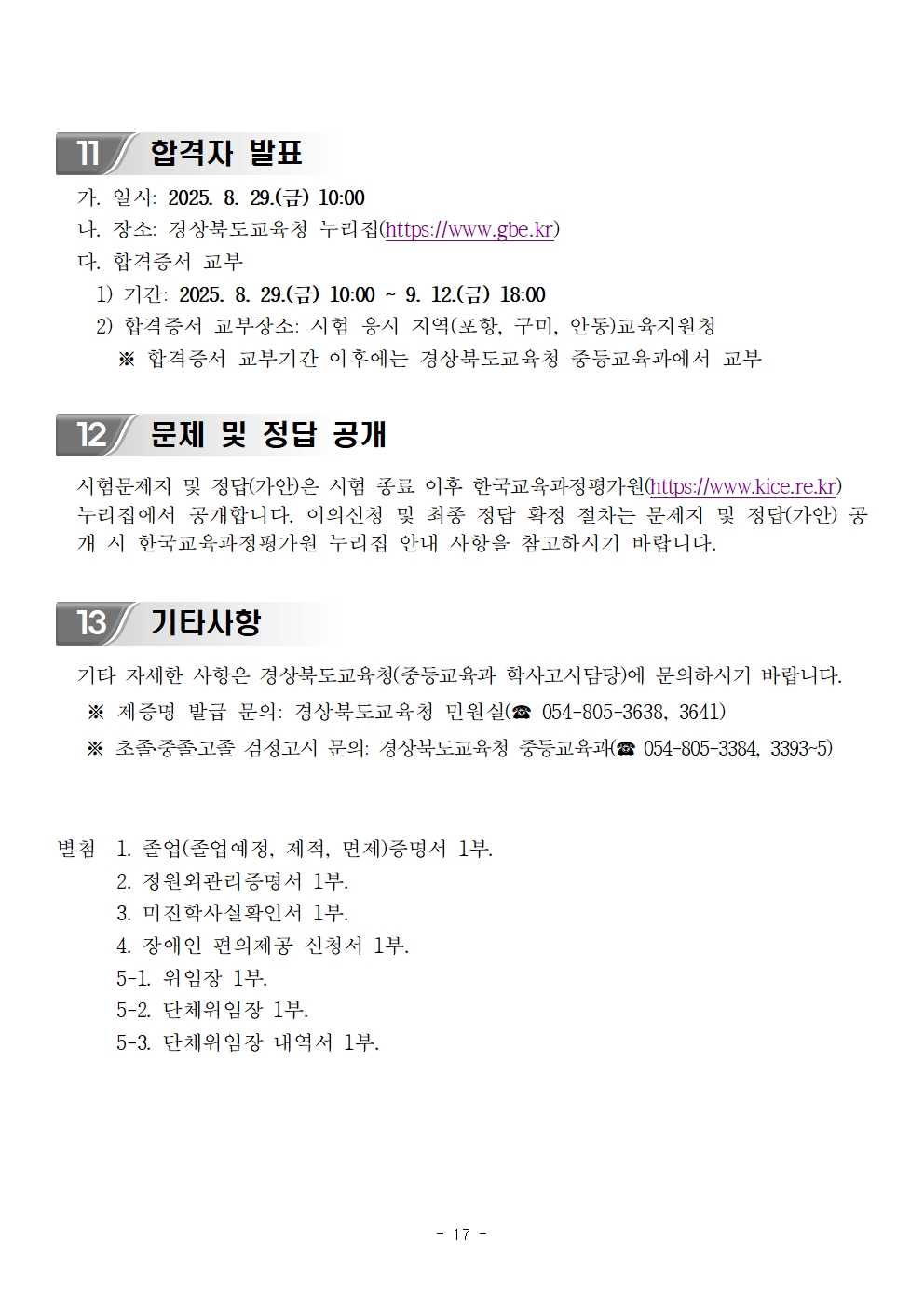 4. 합격자 발표일: 2025. 8. 29.(금) 10:00, 경상북도교육청 누리집(http://www.gbe.kr → 정보마당>시험정보>검정고시>자료실)