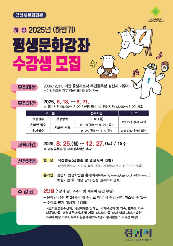 경산시문화회관은 18일부터 21일까지 ‘2025년 하반기 평생 문화 강좌’ 수강생을 모집한다.